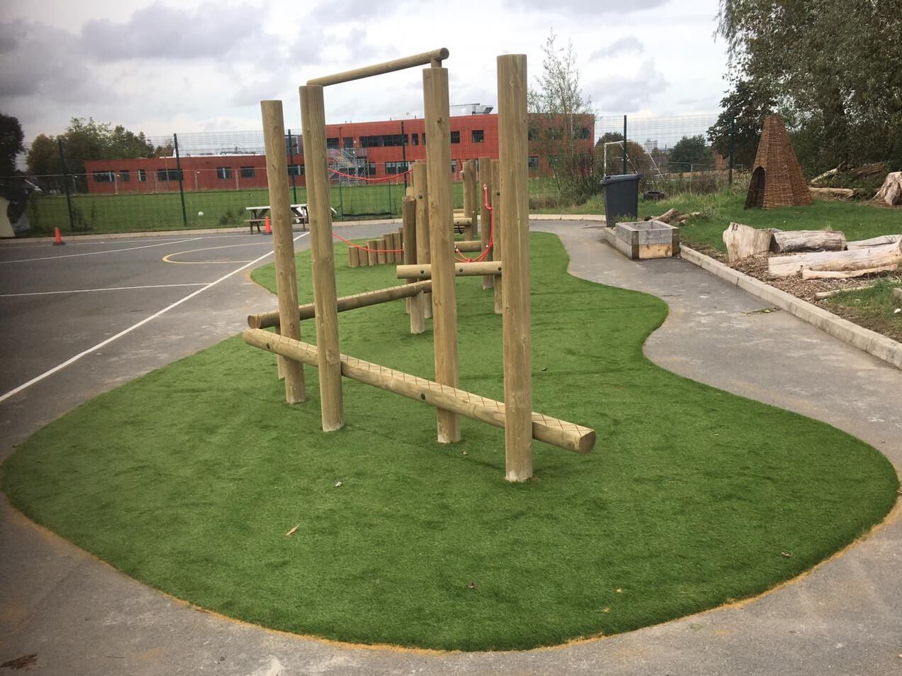 Our most recent artificial grass job was on behalf of Red Monkey Play at Our Lady & St Huberts’ Catholic Primary School in Oldbury. The Primary School have got a trim trail area in their playground, which they wanted to give a more natural feel to. Installing artificial grass around the kit helps break up the monotony of tarmac playground, creating a bright play space for the children.
