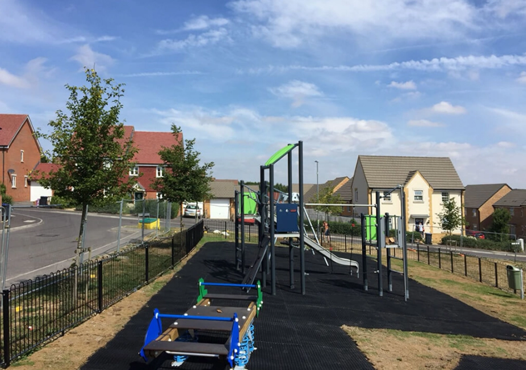 When designing a communal space for children in busy urban areas or in small residential spaces in between or along roads, keeping children safe from hazards is vital. The best surface for children’s play area sites has to take this into account with clever playground design with clear areas they are allowed to go to avoid cars and traffic.
